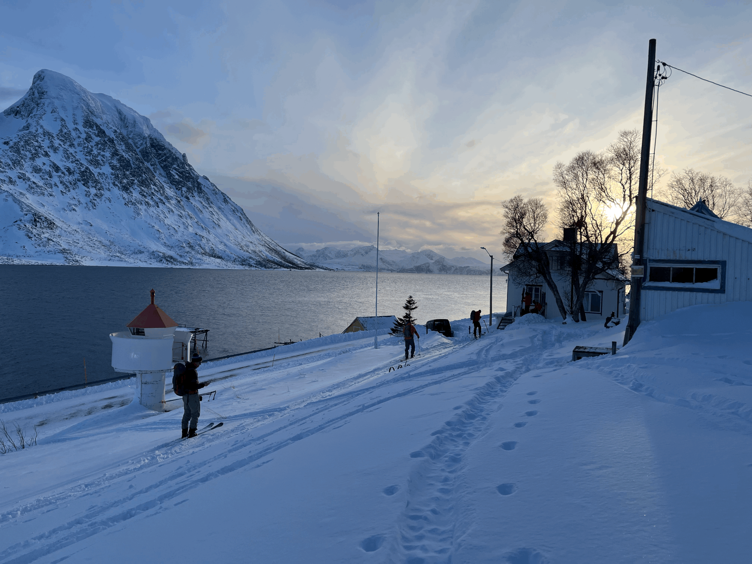 The Island of Arnøya is roughly a 25km x 25km square with a couple tiny villages and 300 total residents. The entire mountainous interior is tree-free open roaming through alpine meadow dotted with icy lakes and steep slopes that fall into long fjords all around the coast. There are 2 tiny grocery/post offices on the island and that is all. Sheep sleep in the road and reindeer roam the mountains and mudflats in the summer. In winter we see Arctic hare and ptarmigan, with the occasional fin of an Orca spotted off the beach. The weather is dynamic with a marine climate, storms blowing through often and spring daylight that stretches into long pink sunsets.